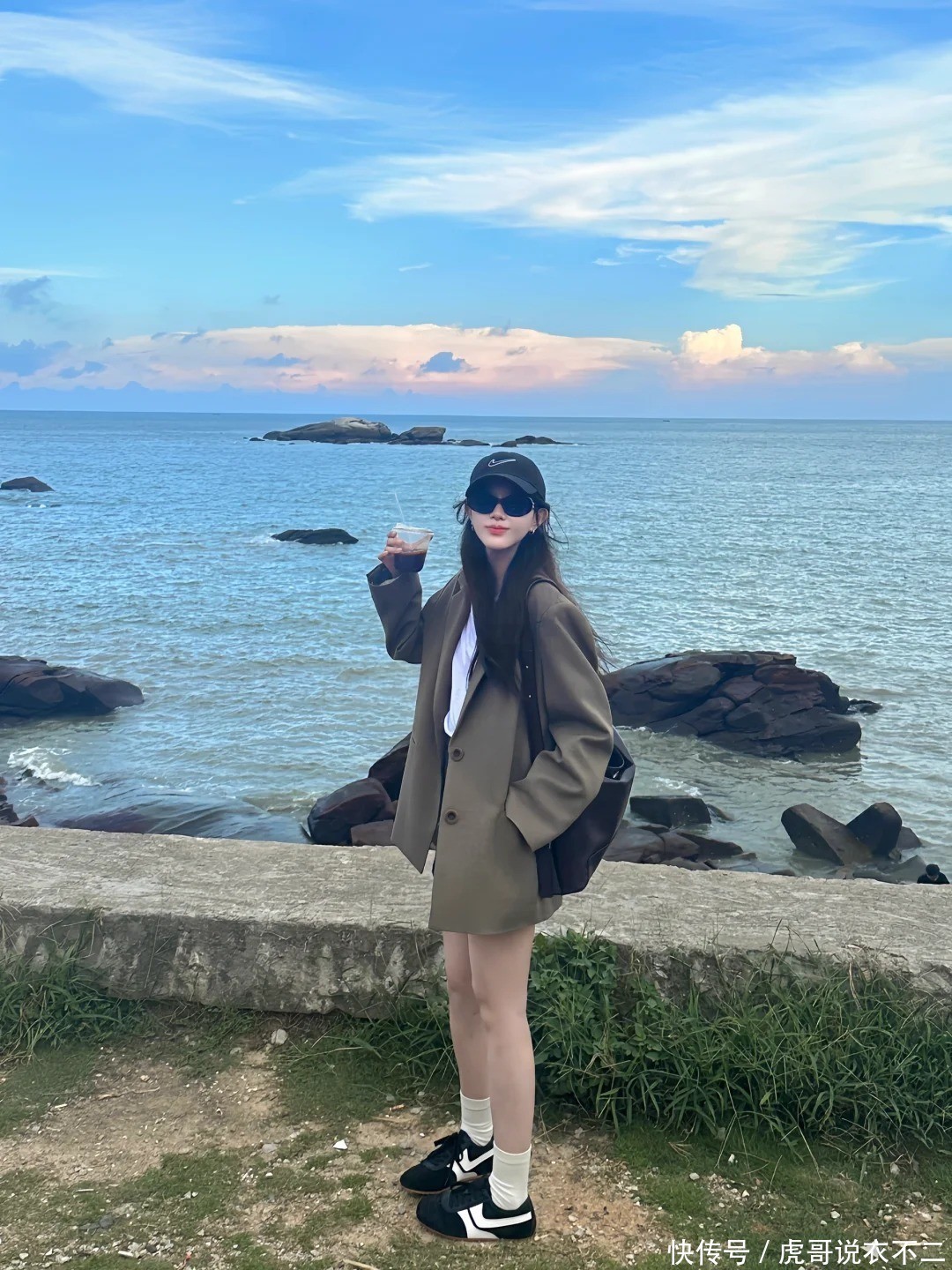 浅卡其西装搭配同色系短裤/短裙,内搭选择白色T恤打底,简约的配色就显得很高级。配饰选择墨镜+棒球帽,包包同样推荐黑色。让整体造型既有层次感又不失清凉感。