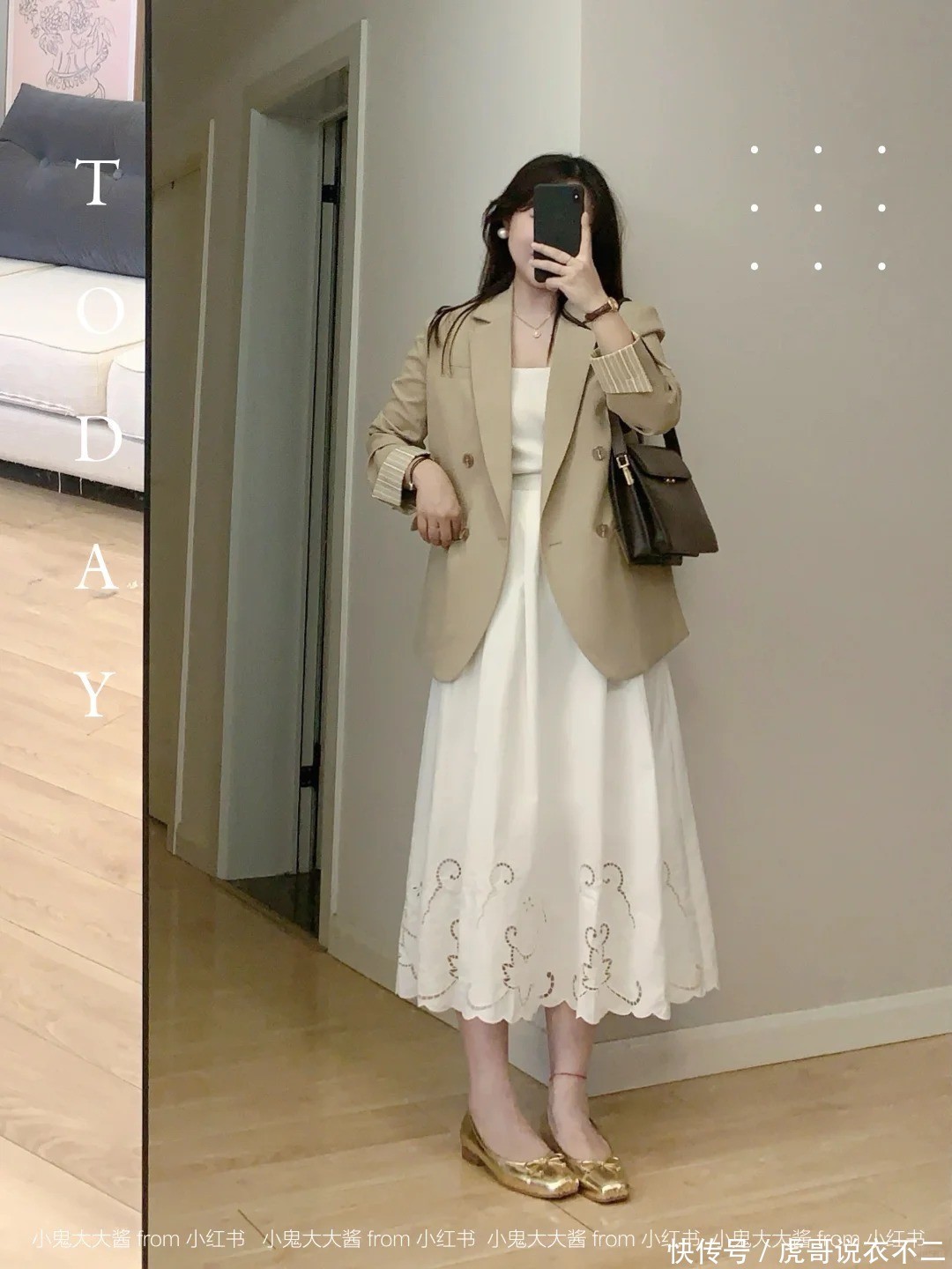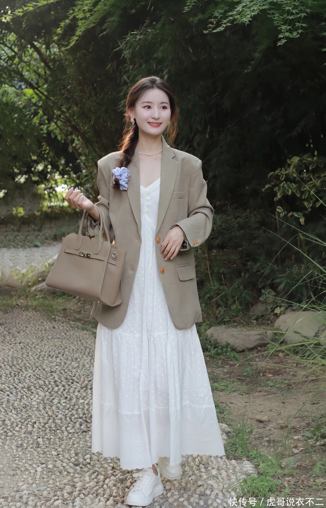 卡其色西装内搭白色茶歇裙,可搭配与西装同色的手挎包强调腰线,白色平底运动鞋,简约高级,充满法式风情。