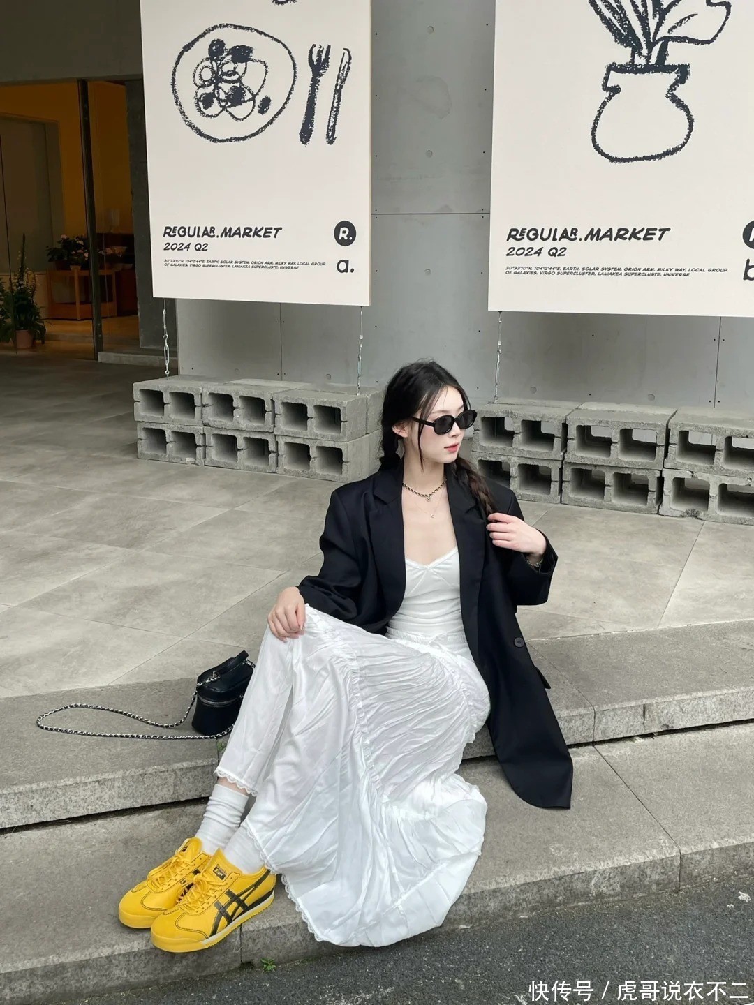 黑色小西装搭配白色吊带裙时,裙子记得选择带有光泽感的缎面材质,让极简搭配瞬间贵气十足。