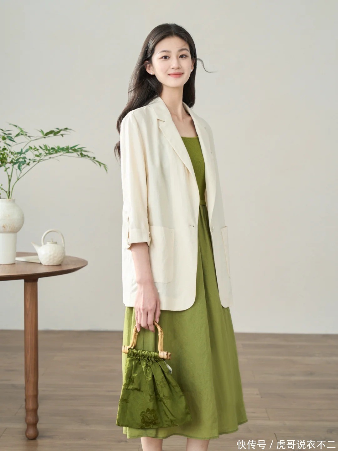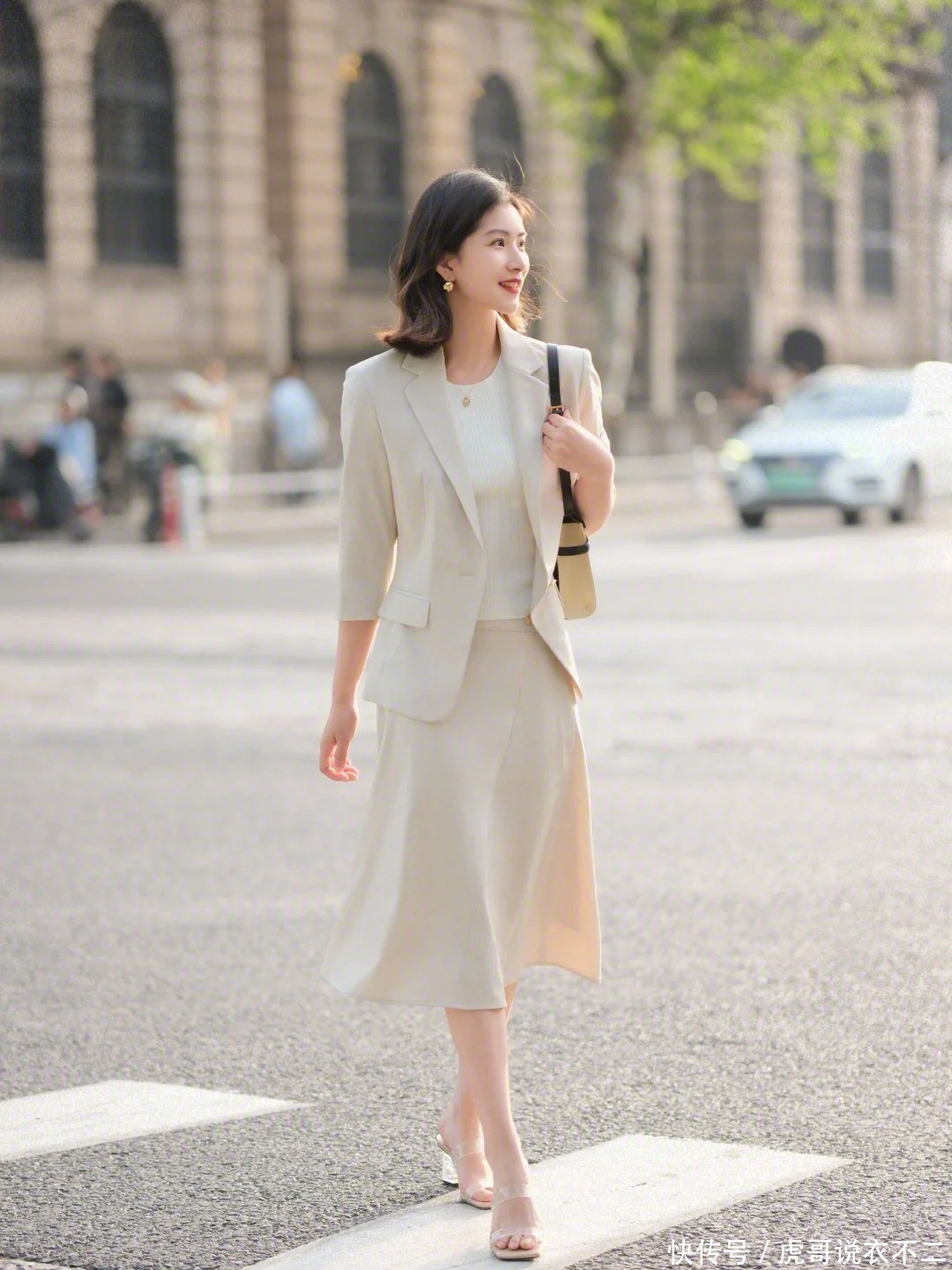 七分袖西装套装堪称初夏救星!西装外套搭配同色系半裙,袖口荷叶边设计若隐若现;或是用奶油白短裤套装搭配草编包,通勤与度假模式自由切换。
