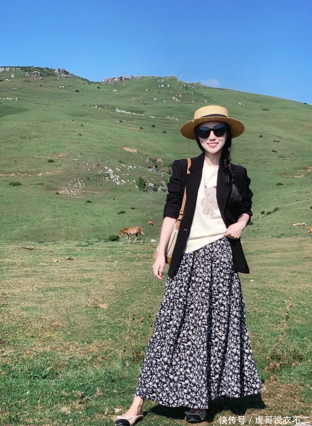 黑色小西装遇见碎花半裙,上简下繁的法则让浪漫与利落并存。