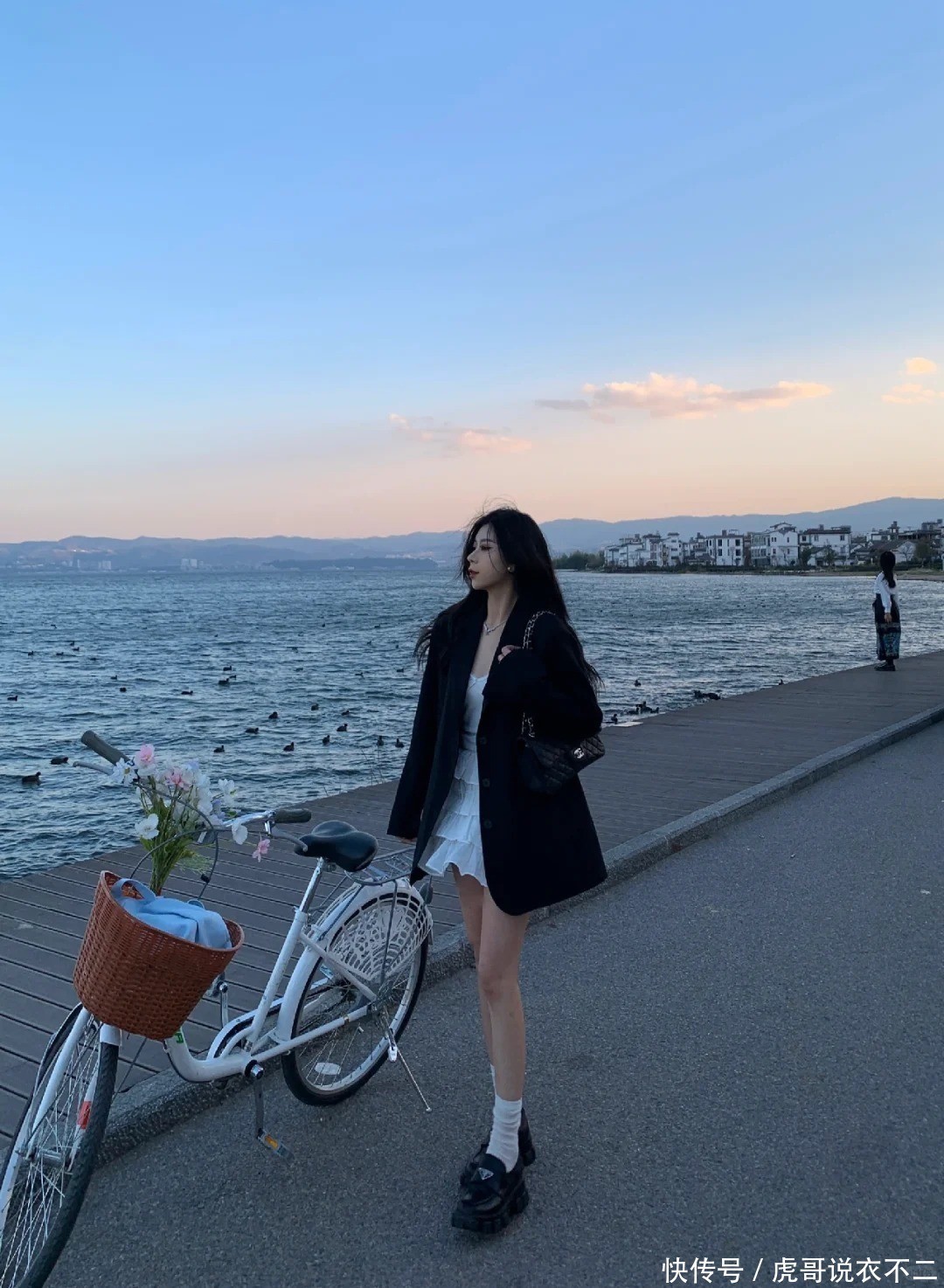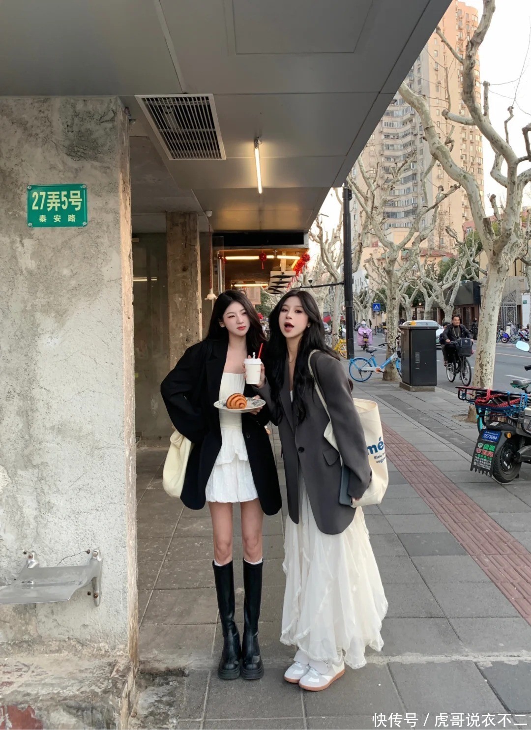 黑色廓形西装内搭白色吊带+A字短裙,外深内浅,遮肉显瘦效果非常好,短裙的A字版型不但显瘦,还可以延长腿部线条。这种"学院风+轻熟感"的混搭,特别适合周末闺蜜下午茶。