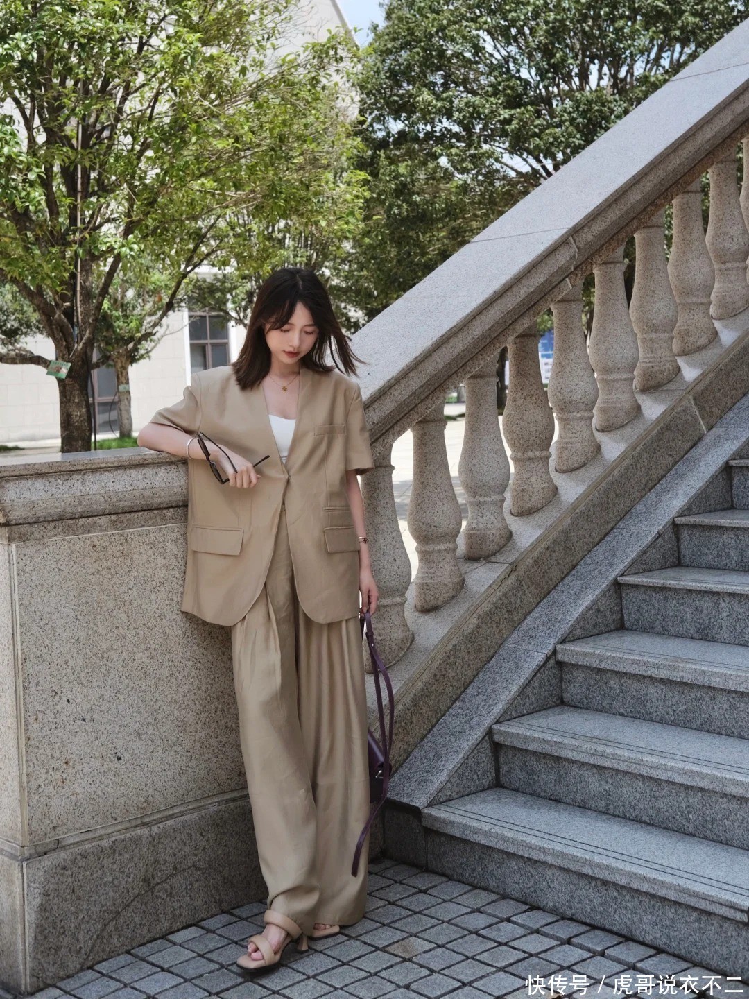 高腰西装阔腿裤搭配短款西装时,选择垂坠感强的冰丝面料,内搭无袖背心,金色锁骨链成为点睛之笔。卡其色套装搭配同色凉鞋,将正式感转化为慵懒chic。