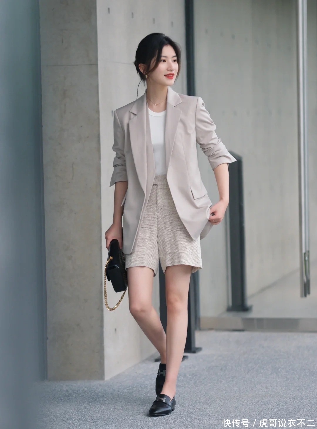 西装短裤套装建议选择棉麻面料,搭配白色T恤打底,袖口卷至肘部,选择黑色的链条包转移视觉焦点。卡其色西装搭配牛仔短裤时,鞋子可以与包包同色,选择黑色乐福鞋,轻松穿出美式复古感。
