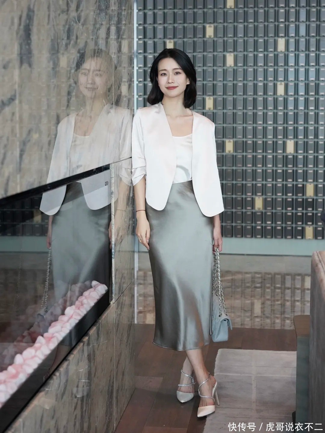短款西装搭配缎面半裙时,内搭选择同色系短背心,适当露腰的设计让比例更优越。记住:当西装偏长时,半裙长度以膝盖以上5cm为最佳。